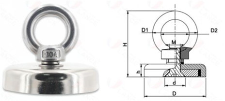 | Model | D(mm) | D1 | D1 | d(mm) | h(mm) | H(mm) | M | Weight (g) | pull force (kg) |